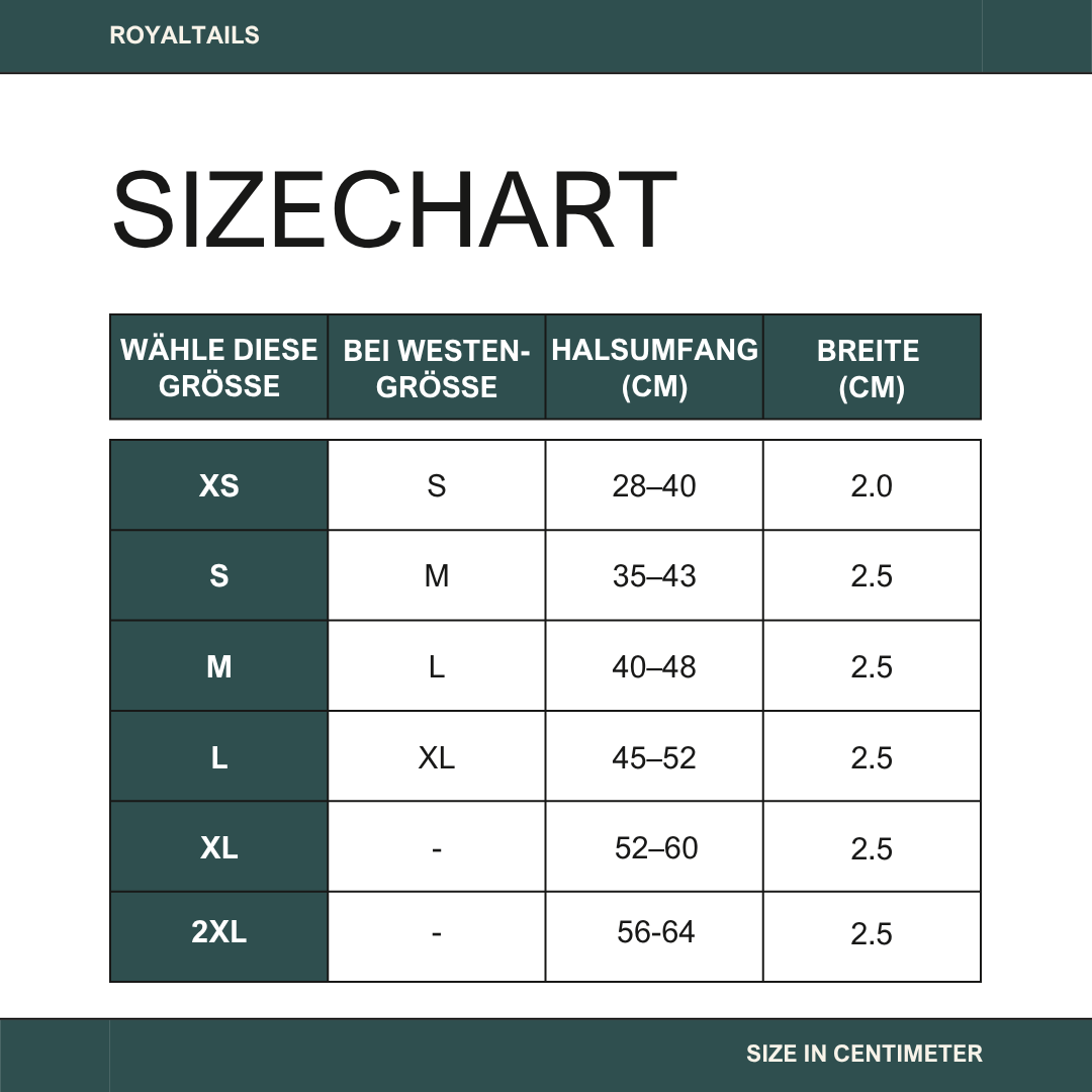 Nutze die Tabelle, um ganz einfach zu sehen, welches Halsband zur Größe der Weste deines Hundes passt.